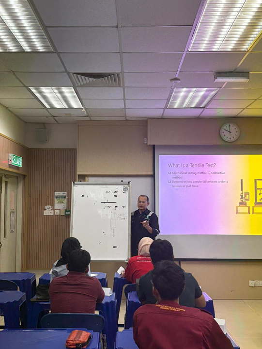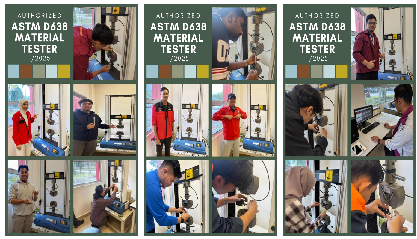 Kursus Authorized ASTM D638 Material Tester with 3D Printer Integration telah dianjurkan bagi meningkatkan kompetensi peserta dalam pengujian sifat mekanikal bahan polimer berdasarkan piawaian antarabangsa ASTM D638. Kursus ini memberi pendedahan menyeluruh merangkumi aspek teori, penyediaan spesimen, pelaksanaan ujian tegangan serta analisis keputusan ujian menggunakan peralatan makmal sebenar.