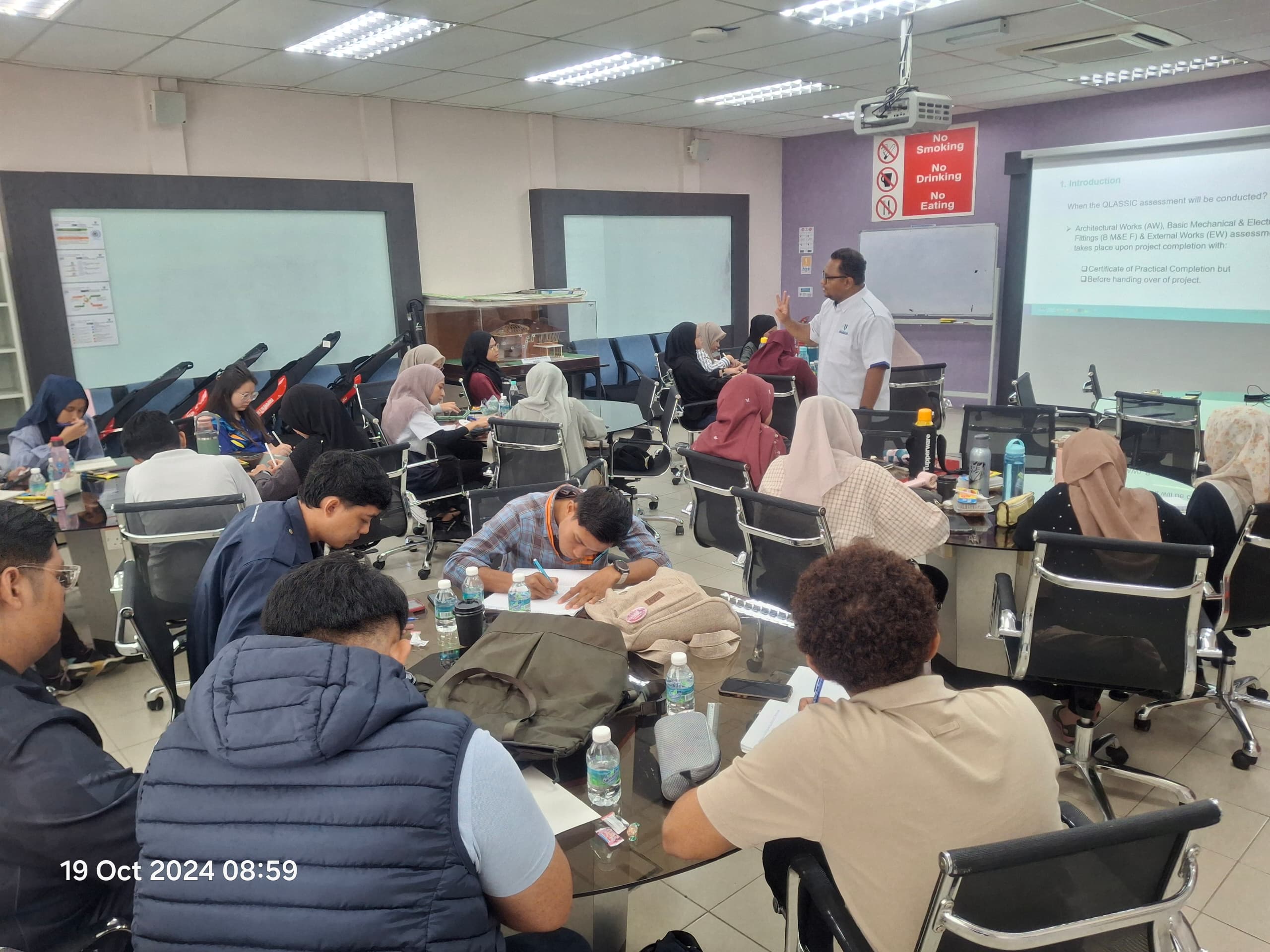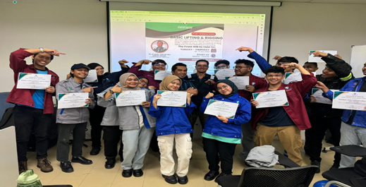 Sejumlah 15 orang pelajar telah dipilih yang merupakan pelajar pra siswazah UMPSA dari pelbagai program dan fakulti antaranya dari FTKMA (4 orang), FTKKP (5 orang), FIST (4 orang) dan FTKA (2 orang). Kesemua pelajar ini telah lulus penilaian praktikal pada hari terakhir dan telah dimenerima sijil latihan (completion certificate). Penilaian praktikal ini dikendalikan bagi menguji tahap pemahaman terhadap modul yang diberikan serta skill yang dipamerkan ketika mengangkat beban dengan pelbagai load. Mereka juga diuji dengan penentuan nilai COG “Centre of gravity”, pengiraan beban, pemilihan teknik sling yang bersesuaian, peranan masing-masing selaku lifting supervisor, rigger, signal man dan tagline man serta lifting plan yang dibangunkan sebelum kerja mengangkat dilaksanakan. Pelaksanaan program latihan teknikal ini diharap akan dapat meningkatkan pengetahuan pelajar berkaitan teknologi semasa serta memberikan pendedahan pengalaman secara praktikal sebagai persediaan sebelum memasuki alam pekerjaan nanti.